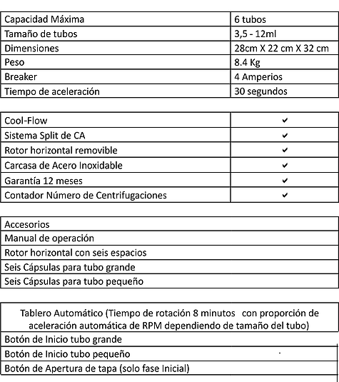Cuenta con control electronico de funcionamiento programado, totalmente digital, permitiendo que con solo un boton pueda activar su funcionamiento, evitando la manipulacion inadecuada de tiempo y r.p.m. para este tipo de procesos. El equipo esta programado y calibrado en ges (g) para utilizar muestras recolectadas desde 2,5cc a 12cc permitiendo concentrar cantidad y calidad de plaquetas en una fraccion pequena de plasma, a bajas revoluciones por minuto y en corto tiempo, y un solo proceso de centrifugacion, generando un muestra libre de globulos rojos (muestras rosadas) o leucocitos (plasma leucoplaquetario. Como todos los equipos especializados para obtencion de concentrados plaquetarios, su rotor es horizontal, permitiendo una facil separacion de fases que se han dispuesto de forma horizontal y no oblicuas como sucede con equipos de rotores fijos que tienden a mezclar sus fases.